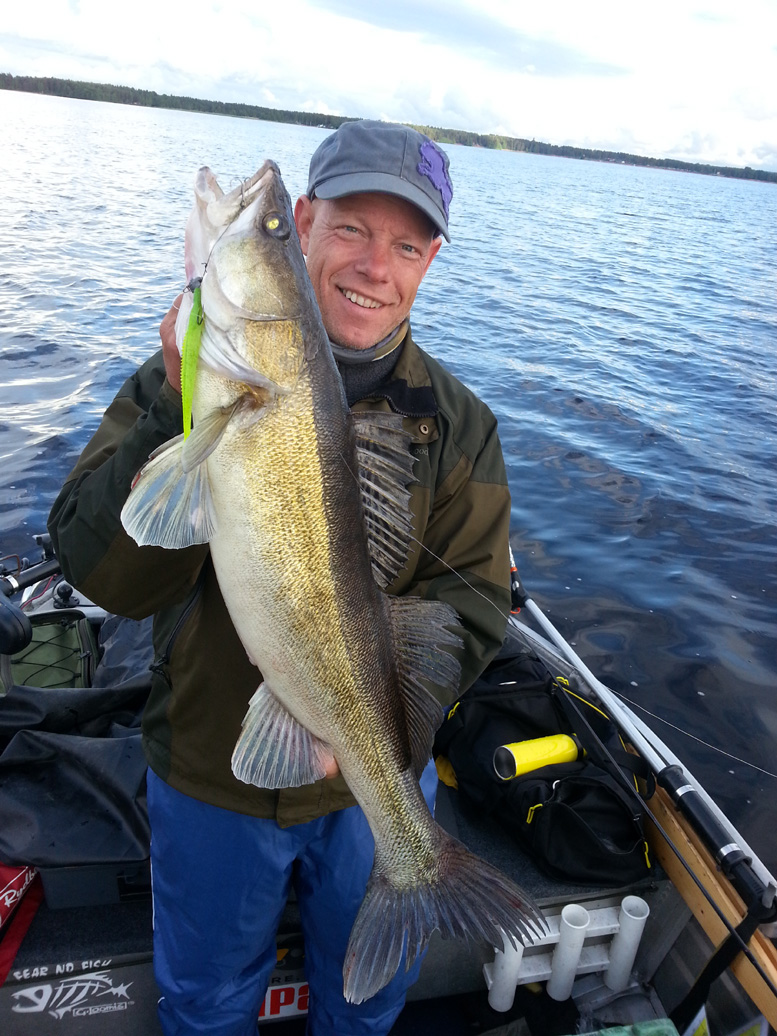 Jo, idag blev det ett gösfiske i Quintrexbåten, och nästan hela dagen så regnade och blåste det (som vanligt)! Vädret var inte idealt för prickskytte, men vi kämpade på så gott som det gick. På eftermiddagen när det var dags att avrunda så sprack himlen upp, och gösen började stiga mot våra jiggar och hugga. Vi landade fem gösar, och missade även flera fina fiskar som vägrade hugga på våra jiggar. Ett av ekona var riktigt-riktigt fint, men denna fisken bara ”puffade” till jiggen mycket försiktigt före att den stack. Till mitt prickskytte har jag valt det helt underbara Shimano Yasei jerkbait 30-70 gram spöt som är ett klockrent vertikalspö för detta fisket, samt en Shimano Caenan 101 rulle laddad med Sufix 832 flätlina. Utan tvekan hade vi bäst fiske idag på Storm Pro Jointed Minnow jiggen (se bild), vi provade det mesta men samtliga hugg kom på just detta Stormjiggbetet! Jag passar även på att be om ursäkt för lite uppdaterade fiskerapporter på senare tid, det har dock varit mycket nu, samt att jag varit deckad i 3-4 veckor (livsfarliga dagisbasiller) – jag ska dock skärpa mig med uppdateringarna! Nu har jag några dagars gäddfiske framför mig, och sedan ska jag ut på havet för laxtrolling – men sedan kör jag igång med gösfisket igen, välkomna!